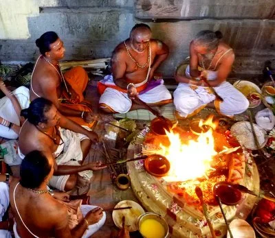 In the Vedic tradition there are two types of rituals; pujas and yagyas. A puja is usually shorter in length and consists of the offering of light, fruit, flowers and coconuts while various mantras are recited. A yagya is more complex, requiring many more ingredients (some require well over 100) and most importantly includes the sacred fire ritual, called a havan or homam with the offering of ghee (clarified butter) and other traditional offerings.